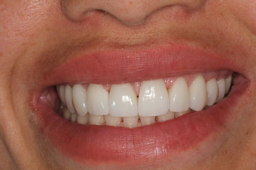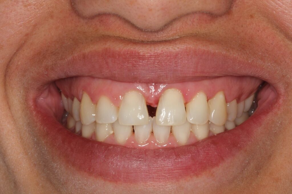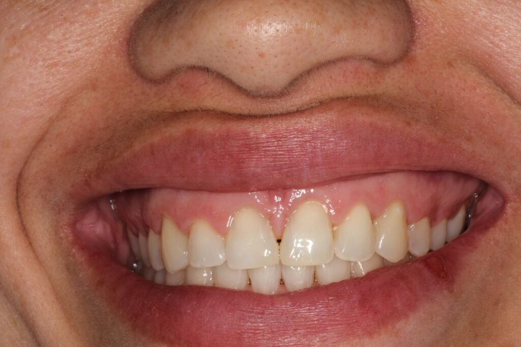 Inicialmente, optamos por remover as facetas de resina. No entanto, ficou um grande espaço entre os dentes da frente, pois as restaurações foram feitas de forma desproporcional para que o espaço aberto fosse coberto. Para corrigir isso, foi feito um tratamento de três meses com alinhadores invisíveis.