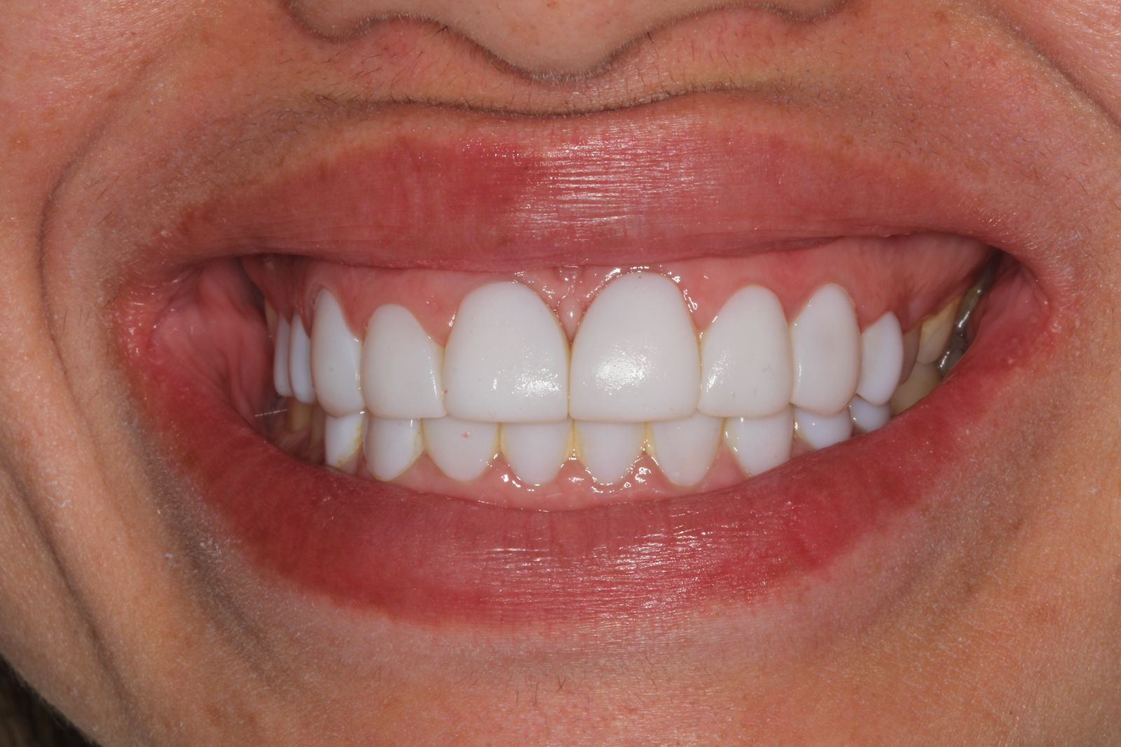 O segundo caso é semelhante: facetas de resina feitas de forma exagerada, especialmente porque os dentistas prometem não desgastar os dentes.
