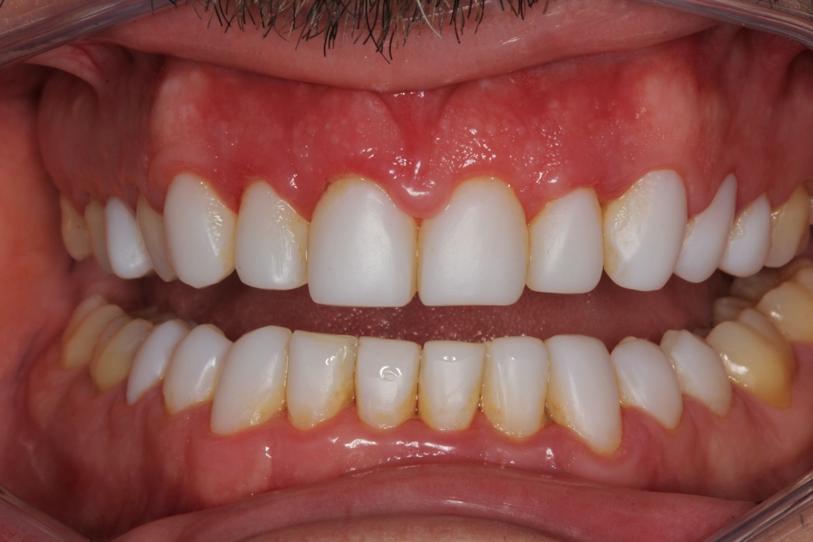 Paciente chegou ao consultório para realizar uma simples limpeza, mas estava com as facetas de resina em excesso e mal adaptadas. Elas estavam gerando inflamação gengival, mas ainda sem sintomas perceptíveis.